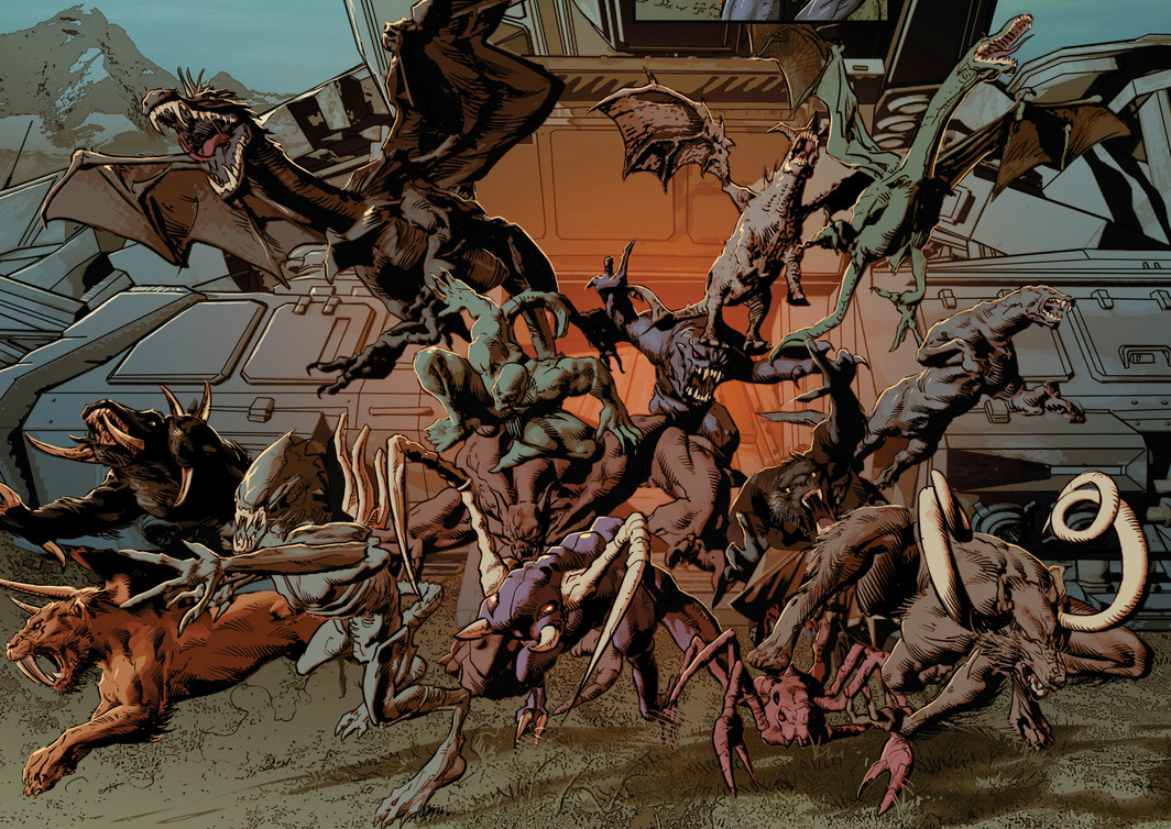 To answer your question, Spencer, I’ve been extremely intrigued by Hickman’s use of evolution as theme in his run, and the Savage Land is probably the most appropriate setting for it. I don’t know too much about it, but the Savage Land has always seemed to be a place where life finds a way, and then another, and another, seemingly without end. The Saber-toothed tiger is extinct right? Don’t tell that to the Savage Land, it’ll just toss ya some dragons, dinosaurs, and whatever the hell else is going on in the image above as a response. It’s almost like the Savage Land is free to let evolution do its thing so, as a setting, it fits quite snugly with Hickman’s evolutionary elements.