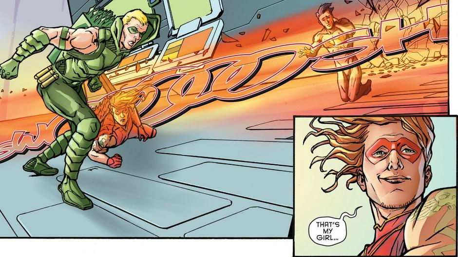 Green Arrow scolds ArsenalPlus, Roy’s hair is CRAZY in this issue. It’s like he’s always standing in front of a fan. Seriously, his hair’s always whipping around – even when he’s stationary indoors. There are adjacent panels, where his hair is billowing in the opposite direction, with no discernible action between them.