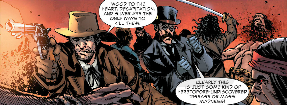 Like, even if it is “mass madness,” there are hundreds of them. Raising your fists menacingly might not offer you the protection you need to survive this thing. I’m holding out hope that future installments might lose the exposition in favor of detective work — justifying Dr. Thirteen’s presence beyond comic relief — and that we might face a bad guy that is neither vampire, zombie, or werewolf, since we’ve kind of seen all of those at this point, and these are somehow all three.