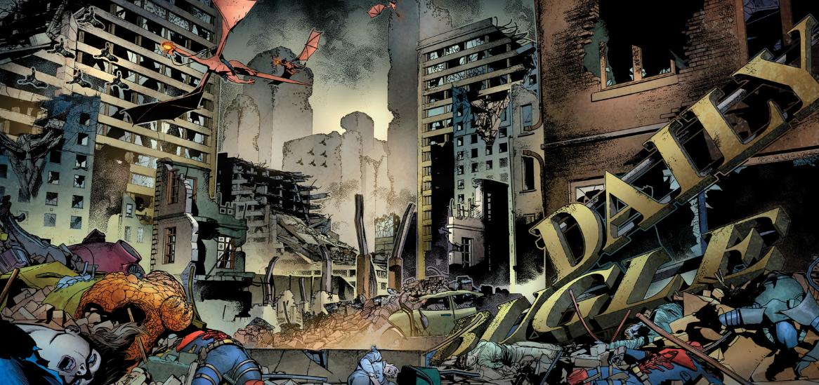 1. So who all is on the ground in that big spread of ruined New York? I see Thing for sure, and maybe Sue Storm, and for a second I thought that was Spider-Man, but they must just be Stark-Drones (as I don’t remember seeing Spidey… and there are two of them). Anyone else catch any other Morgana-age heroes?