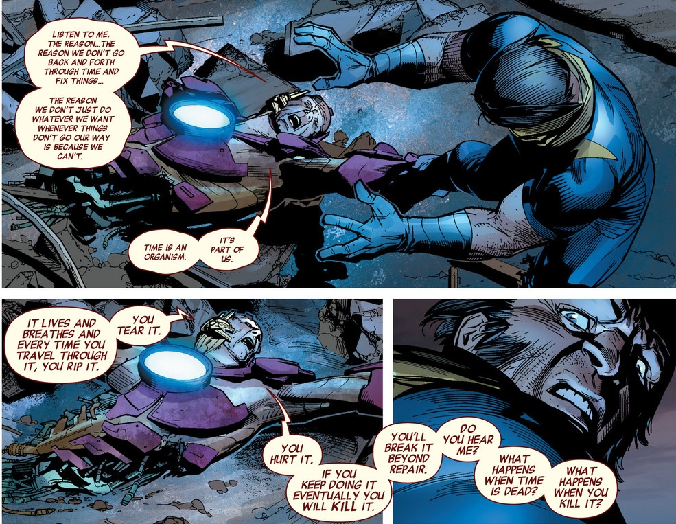 Taylor: What is time? This is perhaps one of the most fundamental questions to human existence, and as such, it has been discussed by mankind since time immemorial.  While philosophers and physicists debate about what exactly time is (it’s a question that still rages today), science fiction and pop culture have popularized the question by using it in a countless number of plots and stories. So none of us should be surprised that a comic book entitled the Age of Ultron (my emphasis) would come to center its plot on time travel and its consequences. Indeed, with time travel we have seen a proliferation of ages in this event increase exponentially, the consequence of which has been the raising of an eyebrow both for better and for worse. Yet while the plot of Ultron isn’t always all that original, issue nine raises the question of what exactly time is and what the consequences of traveling through it could be.