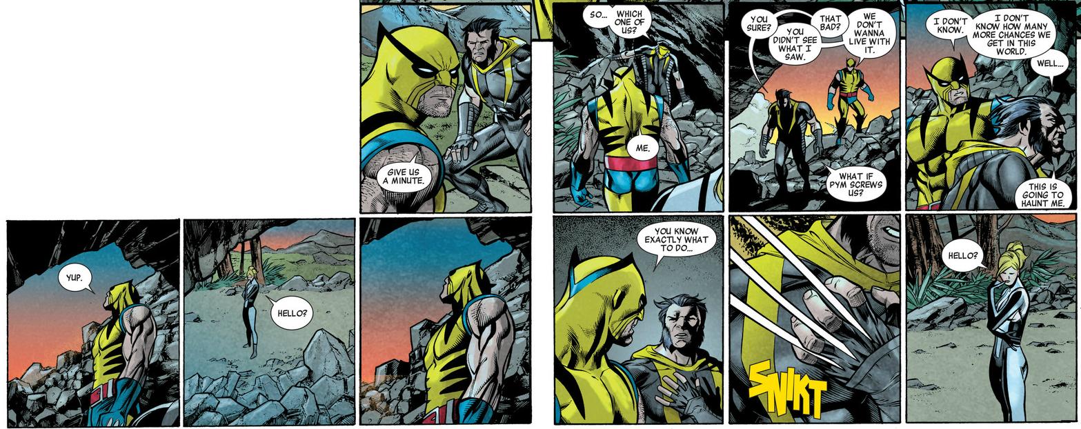 Hey, is it SUPER WEIRD that none of the characters we’d been following since the beginning of this event are still alive? For a long time, Sue and Logan were the last hold-outs. But Susie went out at the beginning of this issue, and the Wolverine we’ve been following since Hawkeye rescued Spider-Man went out at the end. Sure, we have backup versions of both of those characters. But, like, that’s not the same right?