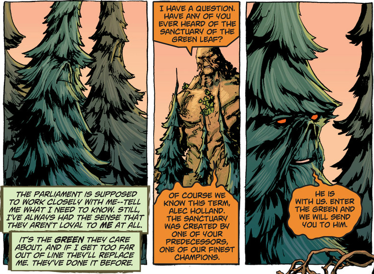 Swamp Thing is back in the swamp, where he’s greeted by Capucine, a thousand-year-old woman who asks for his protection. Fearing she will soon die, Capucine invokes “Sanctuarium Folium Viride”, or “Sanctuary of the Green Leaf”, which was promised to her centuries ago. Alec doesn’t know what any of this means, so he asks the Parliament of Trees, who send him to the former avatar who created the sanctuary. The Avatar shows Alec how he once protected humans who were persecuted for worshipping nature. During their meeting, however, the Green is attacked by Seeder, apparently killing the former avatar and nearly Alec. Drawing strength from the sun, Alec makes it out of the Green in one piece, and he knows where to find Seeder.
