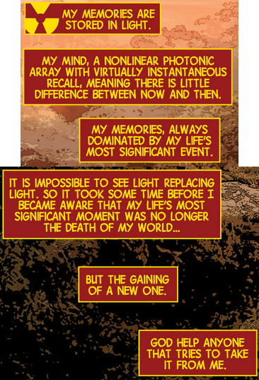 Spencer, thanks for pulling that “It is impossible to see light replacing light” line. It’s a beautiful way to express the way our values and perspectives change over time. Hyperion means it literally – but when you think about it, all of our memories are stored in electronic signals in the brain: we all store our memories in light. I also really like the idea that this short arc (and this issue in particular) was mostly just doubling back on the developments in Issue 4 – as if to remind us of the good character work done there. I totally need that kind of reminder, especially if Hyperion’s going to be a big part of Infinity going forward.