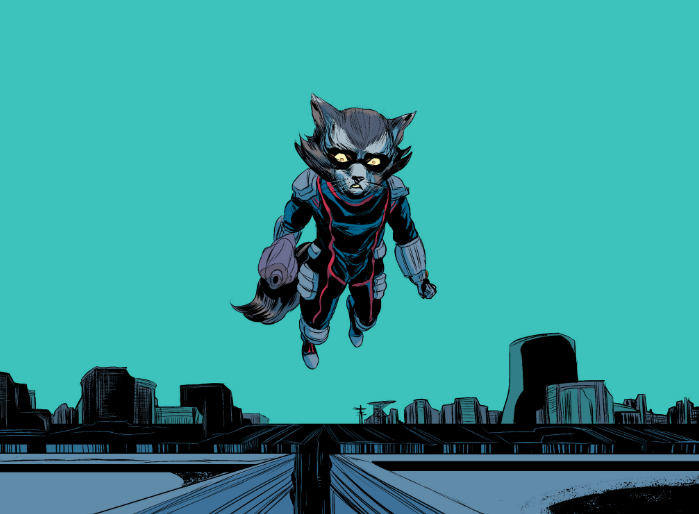meet rocket raccoonObviously, I love him. He’s in a bar, telling a story about taking down Ronan the Accuser single-handed to impress a lady, when some drunk slob comments that he’s never thought he’d see another guy like Rocket. At first, Rocket cockily replies there isn’t anyone else like him anywhere, but when the guy persists Rocket takes it personal. He follows the guy out, threatening him for more info. The guy gets real nervous and makes the rookie mistake of saying the people he works for wouldn’t want him talking about it. Naturally, this prompts a mysterious, hooded sniper to blow a hole in his gut. Rocket takes chase, but loses the sniper, and is left alone and bewildered that there is someone else like him in the universe.
