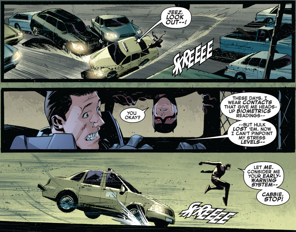 At any rate, the point is: this thing is dangerous — especially now that it’s in the hands of Baron Zemo. Banner and Murdoch may not be the most obvious team-up, but Waid flexes his prowess with both characters to elevate the pairing beyond a marketing gimmick. On the abstract level, Matt’s subtler methods of experiencing the world is a fascinating counterpoint to Hulk, but my favorite moment of this issue emphasizes the differences between Matt and Bruce.