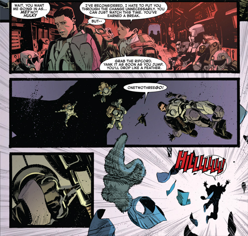 Gimmicky gun aside, I liked the attention given to Banner’s relationships with Hill and Daredevil. Even after Banner pushes Hill’s buttons by chatting about top-secret S.H.I.E.L.D. do-ingsover the phone, she seems to be starting to think about Banner as a person instead of a weapon when she hands him a parachute and tells him he can rest a bit and take a back seat this time. Sure Bruce, even though you do everything you can to drive Hill crazy, you should definitely jump out of a plane in human-form with nothing more than a parachute that SHE PERSONALLY GAVE YOU. She’s a trained agent, a trooper; she doesn’t mind all the times you challenge her authority and break the rules she cherishes. Or, wait, maybe not.