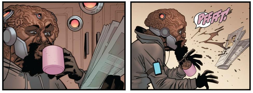 Angrstom Levy doing a spit take with a cup of hot coffee