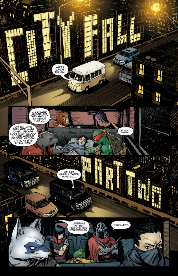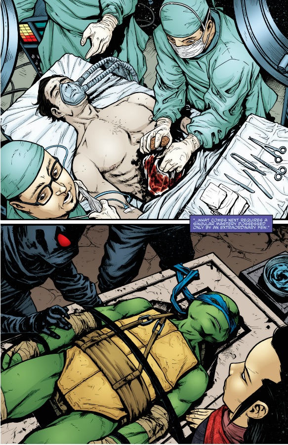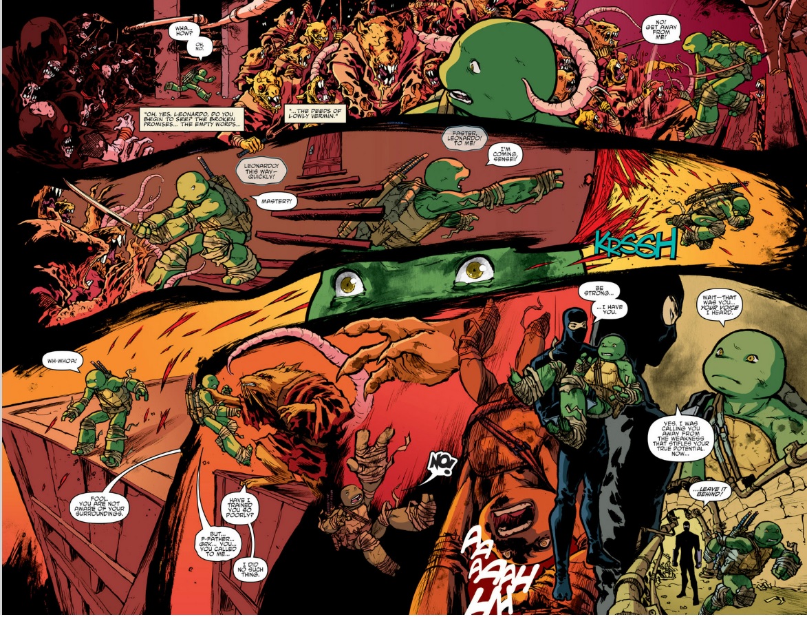 Quite the IntroThis tool starts from the very beginning and prepares us for what proves to be a very good issue. This set up immediately has us comparing the the Foot against the Turtles and has us weighing their similarities and differences. The obvious visual clues are useful – the similar vans, the unconscious passenger, the identical paneling for each story – and helps us understand what the main theme of this issue is. It also has the double effect of putting us in Leonardo’s shoes. Just as he is being asked to consider who is right and wrong, so is the reader. While Leo battles with his conception of his brother and Splinter, so do we consider who is the better ninja clan, the Foot or the Turtles. By putting us in Leonardo’s shoes the creative team generates a powerful issue that makes us both uncomfortable and exhilarated.
