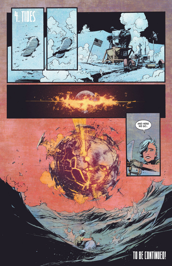 Like Patrick said, Murphy is absolutely killing it here. As I mentioned last month, everything is spot on, and I love the extended inking techniques he employs here — note the fingerprints all over that exploding moon. Still, I’ve got to chide him a bit for drawing the ascent stage of a lunar landing module still attached to the descent stage (something I called out Fernando Pasarin for in Green Lantern Corps 16). I know this is nitpick-y, and I fully appreciate that the only reference photos would feature the ascent stage (since it was the photographers’ ride), but it also strikes me as an obvious, easy-to-avoid mistake (bearing in mind that I may be the only person on the Earth or the moon who could possibly give a shit about this).