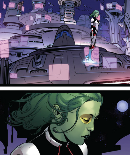 The pacing, the staging, the shifts in advantage all worked to up the tension and really left it unclear who would win. Especially with Gamora’s fight being interspersed with scenes of the more humorous bar fight, and the scenes of Tony’s more serious conversation about the fate of Earth. I agree Mik, it was the quieter moments, the images you included above, and the image of Gamora putting her head down and preparing to be shot, followed by the look on her face when the rest of the team showed up at the end, that really fleshed her out and made her a tough, but sympathetic, character. Pichelli’s work on Gamora here was great.