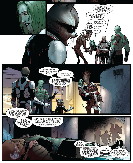There’s some of that fun I mentioned. Our heroes went through a lot in the opening arc of this series, so it’s completely gratifying to see everyone having such a good time. Also, just look at Groot’s face! How can you not love that? There’s just something that tickles the ol funny bone when seeing a giant tree-man drinking through a sippy-straw. I’m not sure what it is, BUT I LIKE IT. Anyway, Gomora and Tony eventually slip away, and from what I can tell, that thing that never happens to guys, totally does not happen to Tony, when he and Gamora attempt to get intimate. After that totally not awkward (because, honestly, that never happens…usually) scene, Gamora leaves to go back to the bar. Only she doesn’t make it as she gets shot in the back by an unscrupulous bounty hunter instead. Meanwhile, back at the bar, the rest of the Guardians have an encounter with some Spartax Royals, and the results are just as you might expect. Back in the city, Gamora struggles to take out the bounty hunter, but is eventually saved by Rocket Racoon and a rather large particle weapon. The Guardians move on to their next destination, as the bounty hunter, who had just previously been blown away…gets right back up again.