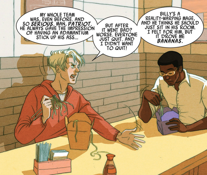 The issue opens with David Alleyne, Prodigy, working at some kind of call center for superheroes (and/or villains…it’s not entirely clear). He meets Tommy Shepherd, Speed, who is also working for the company as a one-man factory. The two bond over being young, disenfranchised heroes (with an emphasis on the young). When their office is apparently burglarized by Patriot, Tommy insists on investigating — he suspects that this burglar is an impostor. Turns out, Tommy’s right, but that doesn’t much help — the burglar spirits him away with some kind of magic touch.