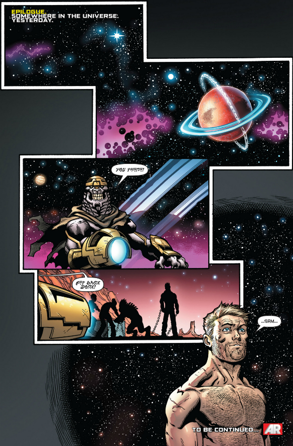Sam hands the ultimate Nullifier over to the WatcherThe one thing this series so badly needs is a strong character at the center. But I’d be damned if I could tell you anything about who Sam is or what he values. Does he like the science fiction action he’s engaged in or does he think it’s silly? Scary? Does he have any reaction to it at all? If there’s one thing in his character that does seem interesting, it’s the constant comparison to his father. Everyone does it at one point in this issue: Rocket, Titus, Sam, his mother. Unfortunately, none of this is as tantalizing as it could be, and the comparisons are either too specific or two broad to really mean anything. Titus tells Sam “your father liked to talk as well,” which is especially strange, as Titus is actually doing more talking in their conversation than Sam is. Not only isn’t this a behavior Sam is exhibiting, it ignores what’s interesting about Nova Sr.’s penchant for storytelling. Even if Sam had continued his speechifying, all he was doing was threatening Titus: not exactly what his dear old daddy used to do.