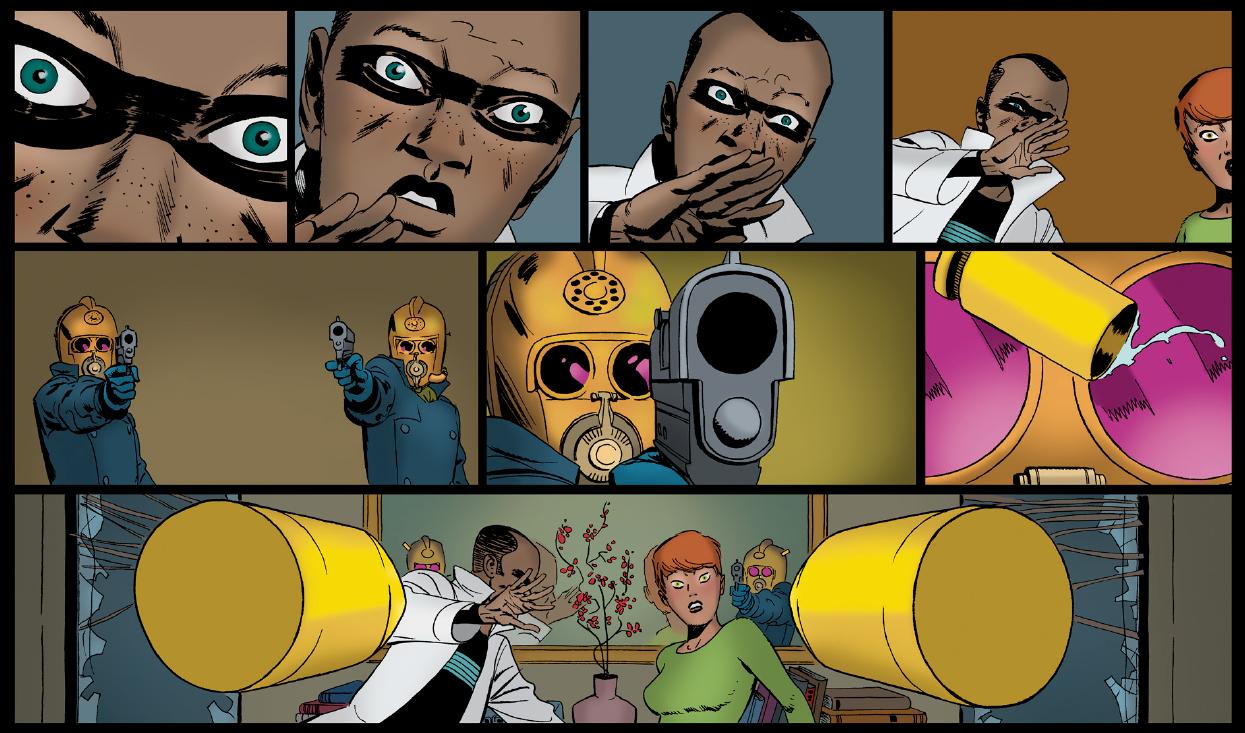 Issue three reveals that the masked francophone assassins we met at the end of issue two aren’t exactly shooting aces. PI and Raveena escape, a little worse for wear, to PI’s grandfather’s. It’s now clear that their assailants were hired guns, and PI can no longer pretend that what’s going on isn’t his problem. Meanwhile, DeGuerre reveals to Nebular that he has some kind of missile.