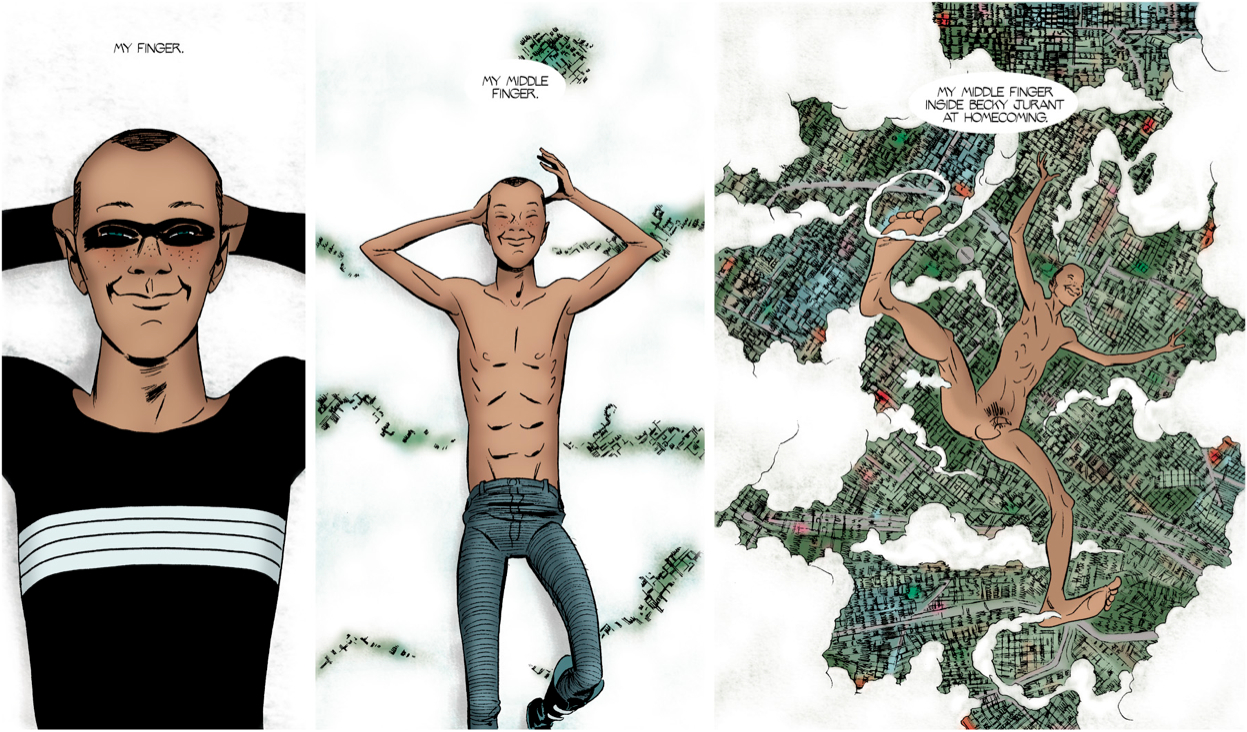 We’re also treated to a closer look at PI. The issue opens with a dream sequence which suggests that his interest in mysteries was solidified when his mother was found dead with no leads on her killer. I say “solidified” because young PI is clearly already interested in mysteries — he’s reading Encyclopedia Brown, and his bedroom wall features a Blade Runner poster. This series has gone to great pains to reveal as much about PI as possible through his pop culture consumption — something particularly interesting given that most people today share their favorite movies/books/music lists via Facebook — but I’m most interested here in what the rest of the scene says about PI. Writer Brian K. Vaughan and artist Marcos Martin go to great pains to make PI as vulnerable as possible leading up to that scene, having him recall a particularly private moment while they strip him naked.