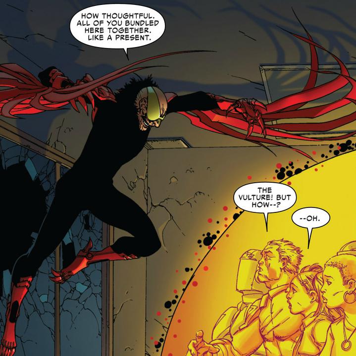 I liked the art in this issue, pretty much throughout. Camuncoli has a gift for making drawing all of these villains with a little extra sinister flair. Vulture’s a pretty dumb looking character, right? I believe Deadpool recently described him as “Larry David bitten by a radioactive parakeet.” But a few Slayer-upgrades, and a much grislier face, and it’s not that much of a leap that he’s able to terrorize these people.