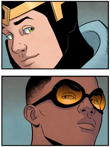 Loki’s hiding behind the innocent smirk of that adorable body he’s hijacked, but Prodigy isn’t buying it. He may have lost his mutant ability to learn everything about a person just by meeting them, but he’s still intuitive—and smart—enough to see straight through Loki’s façade immediately (and judging from how Loki’s frowning in the next panel, he realizes it too). It’s impressive that McKelvie can convey so much information in two wordless panels.