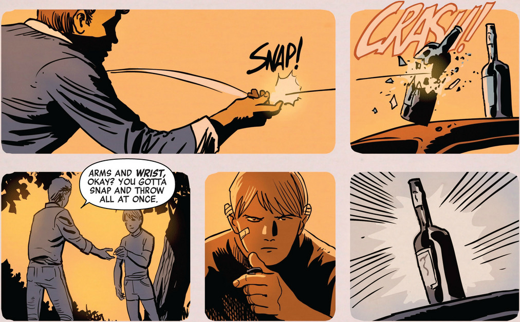 Artist Francesco Francavilla picks up on these loops, returning to the phone motif throughout the issue, and littering the scene changes with match-cuts. It’s his dramatic sense of lighting, though, where he really shines. Fraction makes a point of setting most of the issue immediately around 9am and 9pm, where Francavilla can really cash in on the slanty, reddish early morning and late evening sunlight without jumbling it all together — he generally lights the morning scenes from the left and the evening scenes from the right, but there’s no hard-and-fast rule. He does play hard-and-fast with the panel borders — grid-like throughout, with rounded corners for the flashbacks — but he breaks the pattern for both car-crash scenes, effectively tying them together, in spite of the intervening pages.