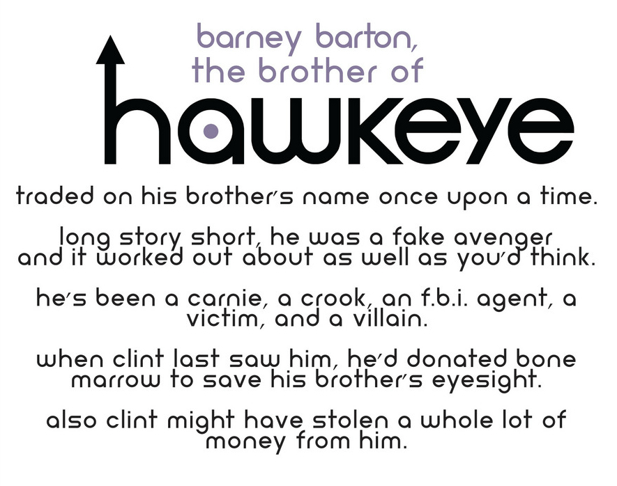That doesn’t seem very villainous. Likewise, the flashbacks paint Barney as the more stable, peaceful brother, while Clint is full of rage—completely understandable rage, considering the circumstances, but rage nonetheless. Based on these flashbacks alone I would have expected Clint to grow up to be the criminal and Barney the hero, but instead, while Clint did have a short stint on the wrong side of the law, he’s spent most of his adult life as one of Earth’s mightiest heroes; Barney, meanwhile, despite brushes with do-gooding, has spent most of his life as a criminal and a vagrant.
