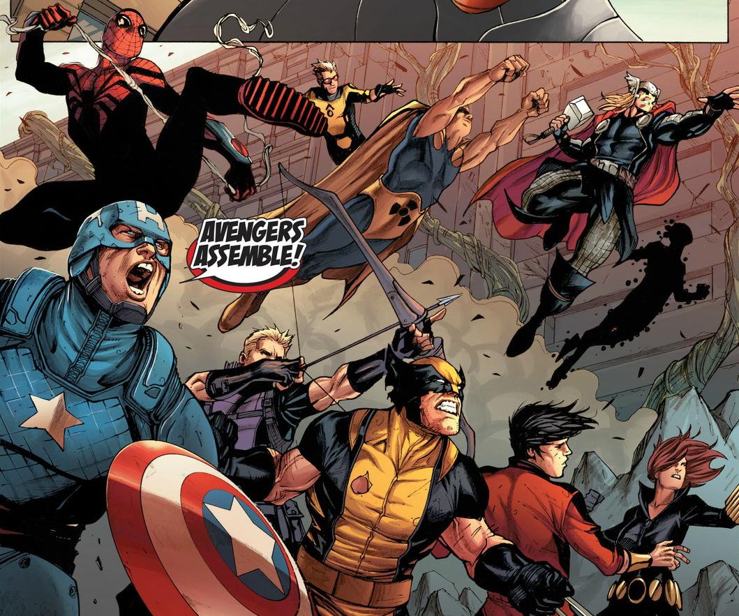 I guess I wouldn’t have that much of a problem with that solution, but only if the heroes were all projecting their unique, compelling personalities during their non-stop-punch-fests. About half of the Avengers involved in the Perth Battle don’t say anything, and even those that do have almost interchangeable dialogue. There’s one page where Spider-Man, Cap, Thor and Wolverine each say one very quick thing before launching back into the fray, but there is nothing one of them would say that the others wouldn’t. There are no Asgardian declarations of War, no stuffy supervillain quips, not even a single “bub.”
