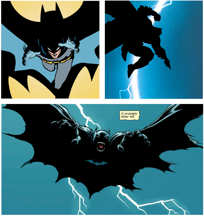 The “of course not” note is one that Morrison hits with gusto, carrying us through a fist-pumping montage of Batman suiting up, punching bad guys, and otherwise being a badass. The message is clear: Batman will always be Batman, no matter who’s writing him. It’s a beautiful sentiment that seems to acknowledge Batman’s future as much as the run has acknowledge Batman’s past. Curiously, some of those nods are simultaneously to the future and the past — Gordon specifically name-drops Zero Year, and check out this hybrid of iconic images from Batman: Year One and The Dark Knight Returns: