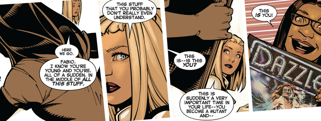 This issue is fairly light, plot-wise, but packs in a ton of character work — all of which again focuses on identity. The first scene alone finds Dazzler and the Medina family fighting over Fabio’s identity — is he a mutant or isn’t he? — while also finding some time to have Dazzler lose control of her own identity.
