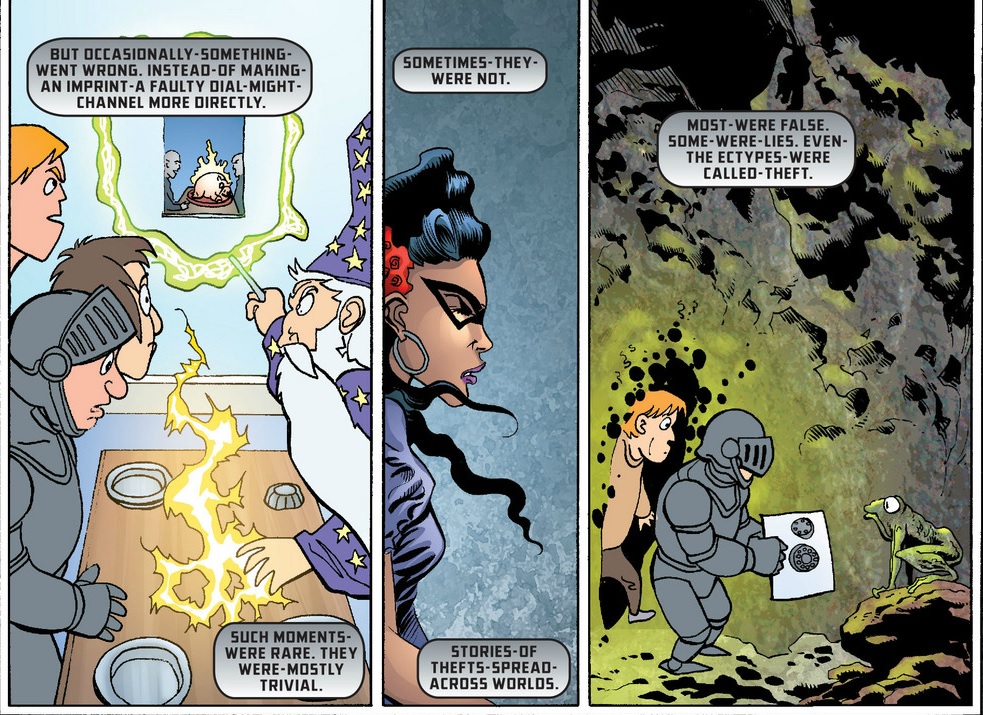 Nelson, Roxie, Open-Window Man, Dwan, and Bansa have arrived at the Exchange – the hub of all realities where the dials were made. The Fixer and Centipede give them a warm welcome, nabbing Nelson and zipping away to the telephony tower. Nelse wakes up to see O dialing 3-6-6-6 for Doom – the lost operator is still dialing apocalypses down onto the outside worlds, hitting the Metacastle realm with a doomsday of ice. Nelse confronts The Fixer about his role helping O, prompting The Fixer to explain his role in all this mess. See, the Exchange used to be a pretty ok place. Nestled in the heart of the multiverse, its inhabitants learned to channel all those other worlds into their own, copying vehicles, objects and superhuman forces for civil use in the same way we tap into a municipal power grid. But then things went wrong. Some of the dials started siphoning bits of reality instead of copying them, leading to sad tales like that of Bumper Carla. Some of the other realities even objected to the idea of copying their own, unique existences. A war began, the mass of external universes marching against the quirkily little world at their core.