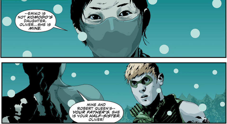The issue picks up with Ollie and Shado on the run from Count Vertigo, as Shado explains how she became Robert Queen’s mistress. Turns out, she’s also an expert archer — so expert, in fact, she was sought out by Robert to train him. Somewhere along the way, they fell in love and had a baby, which LaCroix raised as his own after killing Robert and imprisoning Shado. Why did they keep Shado alive? Well, apparently she knows the location of the Arrow Clan’s totem weapon, the Green Arrow. Anyway, in spite of Vertigo’s best efforts, Ollie and Shado escape Vlatava. Of course, things seem to have gone to shit back in Seattle, where a shirtless mystery man, Richard Dragon, has killed the heads of two of the city’s crime families, with designs on the third.