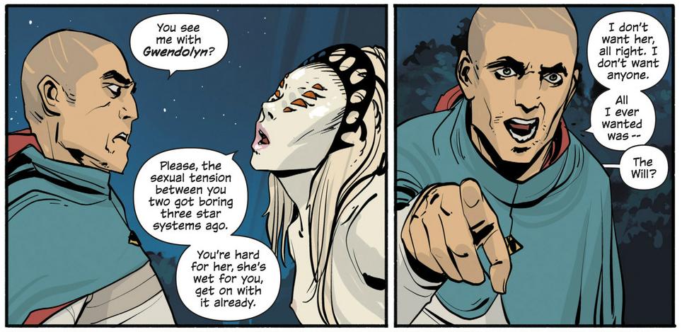 Brandon: If there’s one thing Brian K. Vaughan comics have in abundance, it’s compelling characters. If we were to never check in with The Will, Gwendolyn, and Slave Girl again, there are indeed plenty of characters to keep us busy and engaged elsewhere. But not only do I think that won’t be necessary, but I think it’d be profoundly disappointing. You mentioned Vaughan’s desire to tell a story about a normal family who want nothing to do with a massive space war, and he’s doing that well with Marko and Alana. But he’s telling a related, similar story with The Will, Gwen, and Slave Girl/Sophie – the story of how this war creates a family.