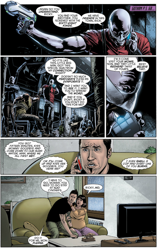 As the issue opens, Jim Gordon is getting closer to tracking Batgirl down, inquiring with Charise Carnes about her recent interactions with Batgirl. Charise agrees to cooperate with Gordon, but is also suspicious that he might be onto her nightlife as Knightfall. That seems like a dead-end, but Gordon is leaving no stone unturned. His next stop: Ricky Gutierrez (that is, the guy Babs just had the date with). Of course, Ricky has his own problems, as his brother is being held hostage by the 68 Kings, a gang that apparently has some kind of agreement with Knightfall. Ricky goes to meet the 68 Kings, leading Gordon to their door. Charise gets wind of this, suspects that he’s onto them, and puts a hit out on him to be carried out by basically every villain Babs has sparred with in the New 52. Tragedy strikes when the police storm the gang compound, and Gordon accidentally shoots Ricky.
