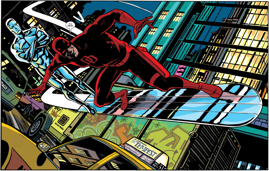 Additionally, look how it basically turns the air into water. With Daredevil sitting calmly on the board and Ru’ach slumped over it, you can image this staging on a regular old water surfboard (a preposterous idea, I know!). Diving and swimming gracefully through the air is a hallmark of so many of Marvel’s heroes. Even those that can’t fly — like Daredevil and Spider-Man — glide through the air with no fear of plummeting to the ground, like it’s water. This isn’t revolutionary, and if I were still experiencing my “WTFSilverSurferLOLZ” problem, I’m not sure the observation would do much to change my mind. But I found it neat, so I thought I’d share.