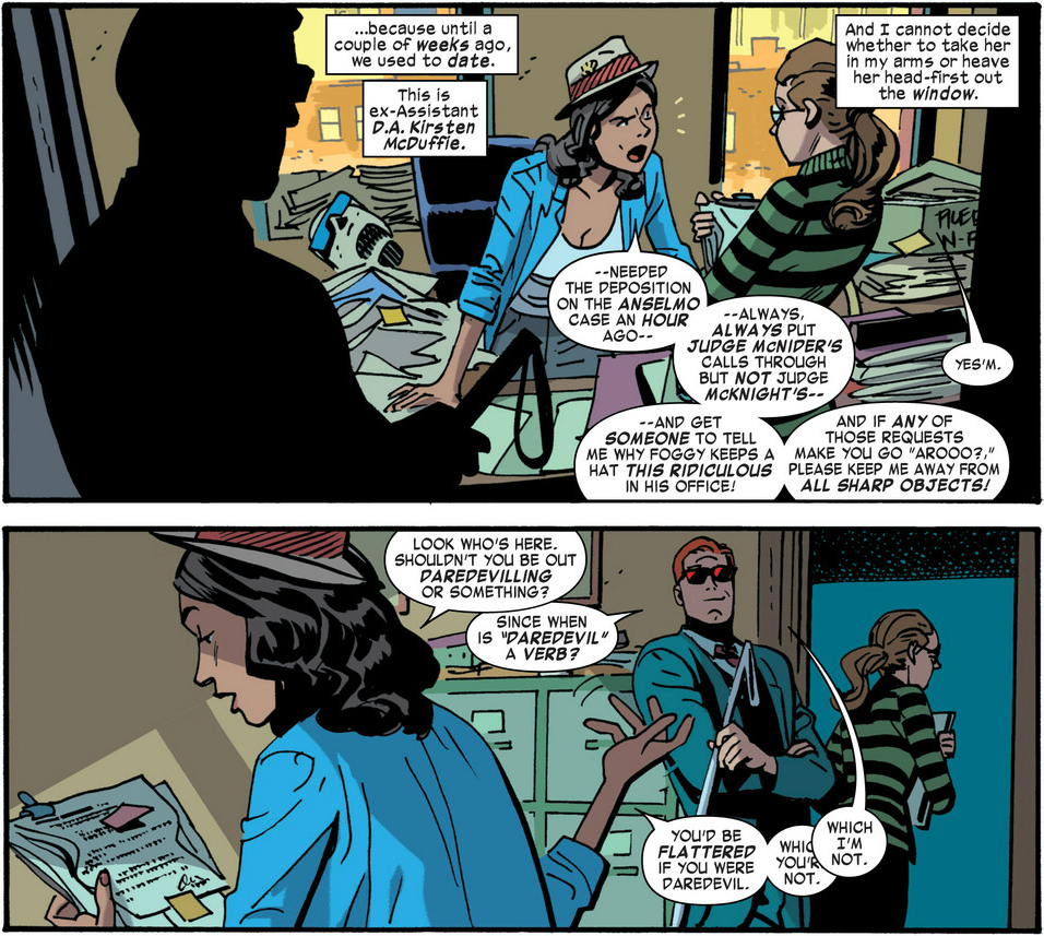 It’s a surprisingly serious moment to fall out of such a frivolously fun issue, placing Matt and Kirsten’s relationship in the spotlight in a way it hasn’t been in months. Their relationship fell apart at basically the same time Matt and Foggy’s did, which meant that it got put on the back burner as Matt patched things up with Foggy and dealt with his cancer treatment. Now that Matt and Foggy are a bit more stable (and now that Kirsten is working in Foggy’s office), Matt can start to sort out his feelings with her. That is, if he can avoid throwing her out the window.