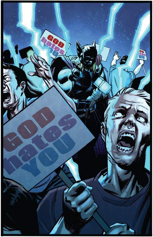 But what does it mean for a character ostensibly created in a barbaric ancient culture — thus representing barbaric ancient values — to be running around the modern day? Young Thor may claim to value our petty fighting and defilement of every land, but Thor the Avenger’s values seem a bit more modern. In one of the early scenes, he brings an extinct, famously delicious fruit to a death-row inmate as his last meal. In another, he crashes what looks to be a Westboro Baptist Church protest: