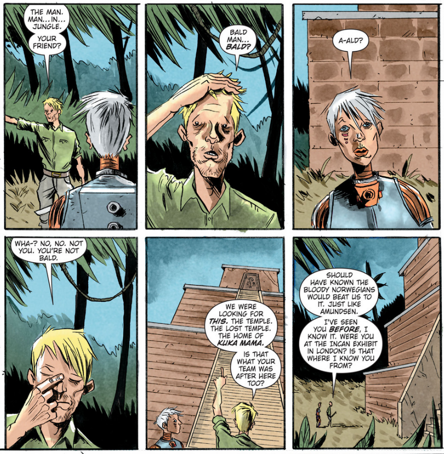 I like how clearly Lemire sets up who we get to understand on each page, the red, spacey gutters accompanying Nikia’s pages and the blue jungle gutters on William’s. I feel like we’ve seen this sort of thing before: the two people communicating with eachother despite a language barrier (like the Colin Firth story in Love Actually). But there’s something cool and unique in that we also can only understand one of them at a time. Like, even though we have the capacity to read both of their languages, we only really have the ability to interpret each character through the eyes of the other.