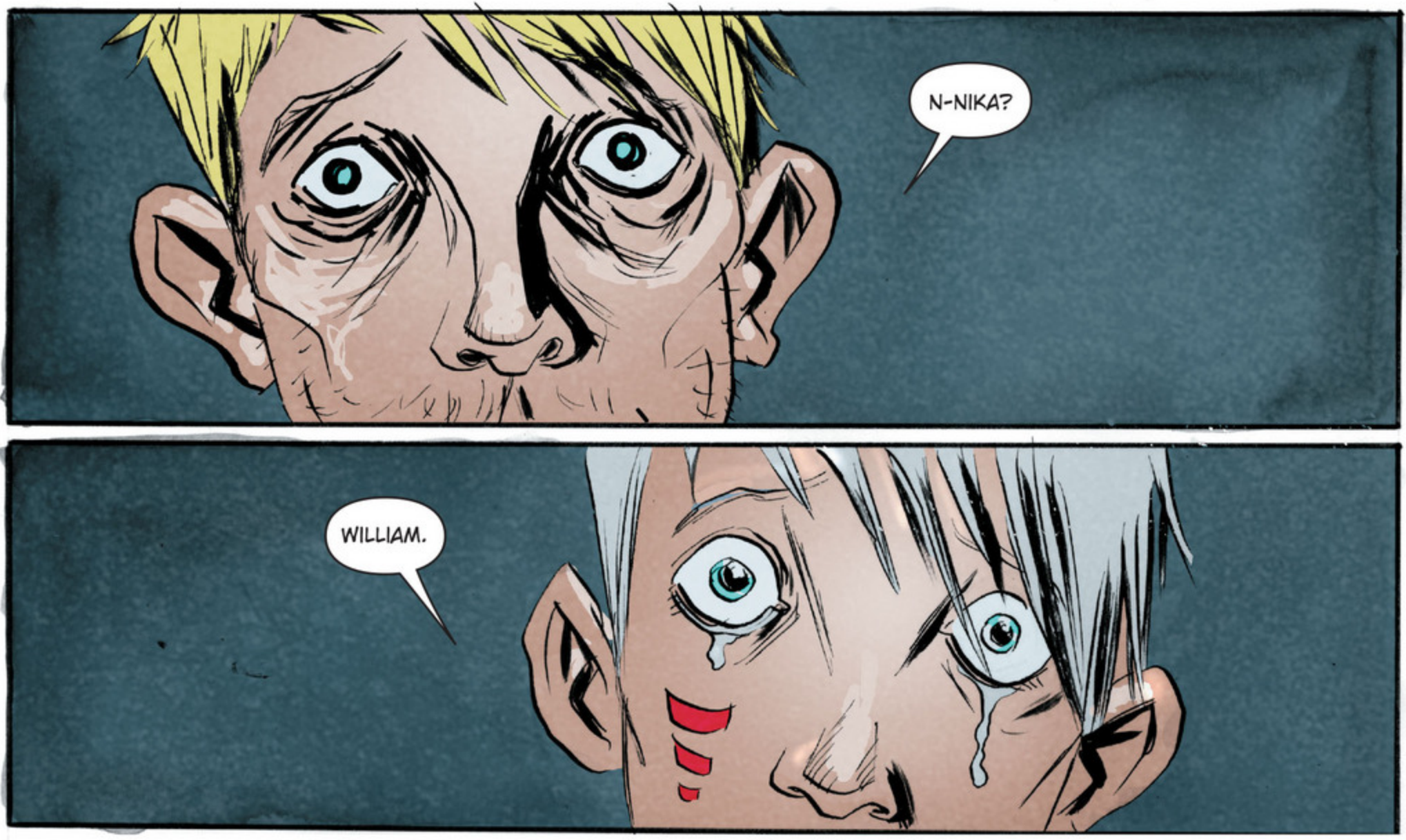 If you ignore the fact that William has no pupils, that’s a powerful image, and a very significant moment. It suggests that they do know each other and, if you ignore the fact that William vomits in the following panel, that they care deeply for each other. I don’t know how this is possible or what it means, and it seems more than likely that the next issue will follow these characters in two separate stories again, but the seeds of a great and truly unique love story have definitely been planted.