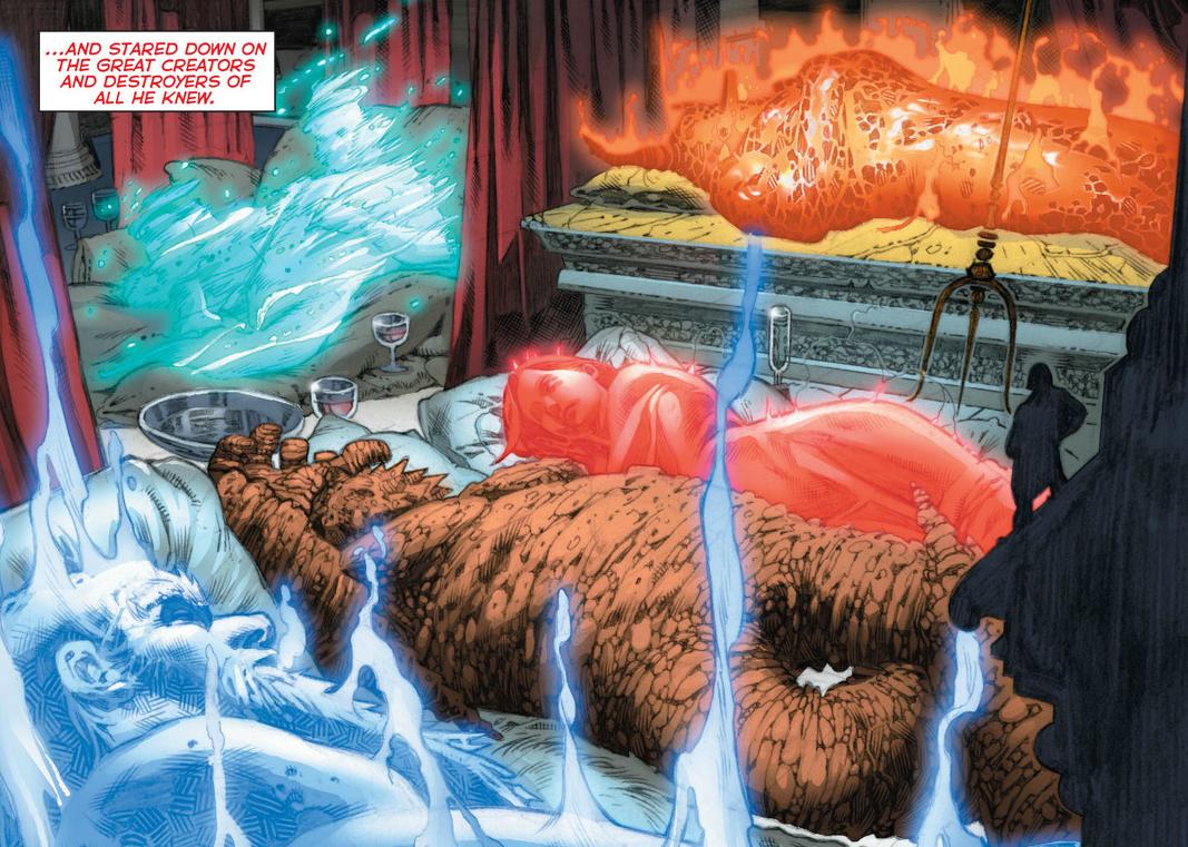 That little silhouette in the foreground is Darkseid. He looks so tiny! Also, look how simply these gods are designed. They’re simply human forms made of different colors and textures. Paulo Siqueria and Netho Diaz don’t ever really top the spectacle of these elemental gods in bombastic battle, but that’s a pretty striking standard.