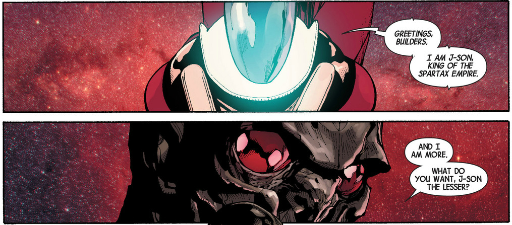 Meanwhile, as the other Avengers tend to displaced refugees on Behemoth, the Galactic Council tries to figure out a way to fight the Builders. Thanks to their discovery that the Builders are headed towards Earth and some choice inside intel given them by Ex Nihilo, they appear to have come up with a suitable plan. Unfortunately, J-Son may have ruined it all. Infuriated that backwards Earthlings are to blame for this whole fiasco, he attempts to negotiate with the Builders. That proves impossible; instead, the Builders simply lock onto his signal and appear to destroy Behemoth!