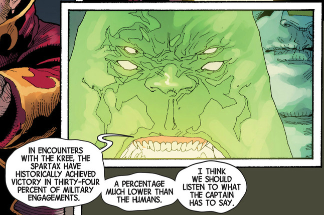1. I liked seeing all the rest of the members of the Galactic Council characterized too. I still don’t know like any of their names, but it is starting to feel like they have personalities. Also, how crazy is it that the most humany of them (J-son) is the traitor? No, no, not the blobby green dude or the killer insect or even the fucking Skrull – it’s the Lord of Spartax you gotta watch out for.