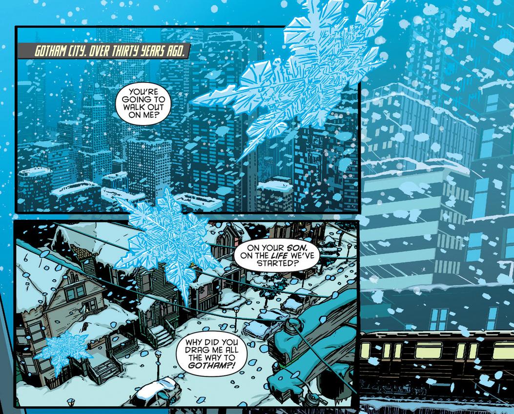 The story is slight, and it’s largely a retread of the emotional territory covered by Snyder over a year ago. But Palmiotti and Gray seem to have struck on a meta-nerve here, emphasizing Freeze’s confusion and making it our own. For starters, the chronology of this issue is fucking crazy. We begin “over thirty years ago” and the narrative ricochets spastically around time, with brief detours to Victor’s life as a child, his time working at Wayne Labs, the night he fought Batman, his therapy sessions, the night of the breakout, searching for his family, and their disastrous reunion. The full-page spread on page four looks to be the very last thing that happens in the issue, and the action leading up to those final moments is muddled profusely. As Freeze explains his past to his new family, the pages fill up with unused white space, and the story becomes gradually focused on the fighting and pointless bickering between Batman and Freeze.