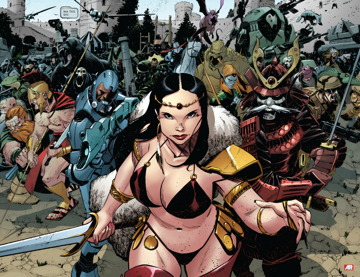 "For…Glory?"You’ve got spartans rubbing elbows with samurai, tanks alongside mounted knights, and while you might see some parallels with Ares’ “all of them” army from Wonder Woman 23, I’d gladly draw your attention to the monsters, robots, and that dude in the Halo armor — this army is drawing from armies past AND future. It’s a zany concept, but one we actually spend relatively little time with, since there’s so many other goofy ideas to get to.