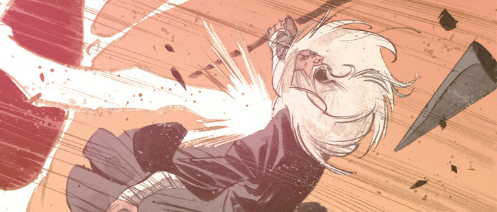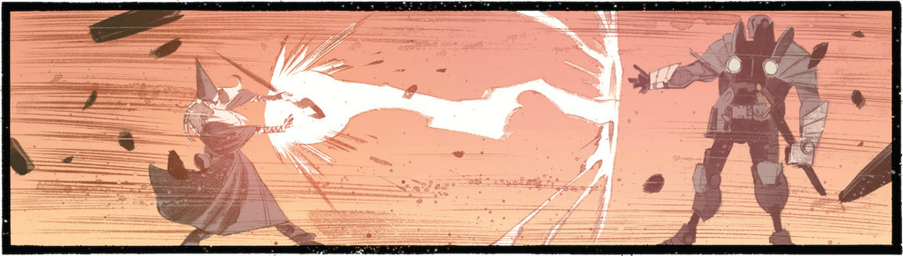 Ethan: I figure Merlin’s hat is a bit of a bellwether for how well things are going at any given moment. Basically the same thing as most other character’s lower lip: our heroes can get thrown through a few walls without so much as mussing up their hair, but when they’re really getting hammered, they might get a bloody lip. In the panel you included above, Drew, Merlin is rocking his magic Hadouken, feeling pretty good, and then (watch the hat) –