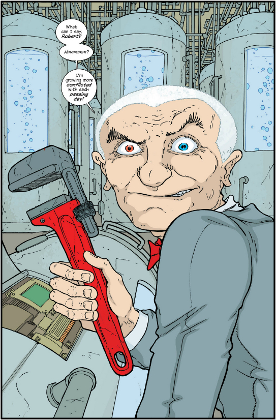 Pitarra is similarly inventive with other settings — I love the giant eyeball on Einstein’s lab bench — but I also want to take a moment to point out just how vital colorist Jordie Bellaire is to this series. I’ve been hot and cold on the red and blue color scheme (color theory joke), but Bellaire has always managed to maintain clarity within those sequences. She really shines in the closing reveal, where she balances the red and blue — and not just in Oppenheimer’s eyes.