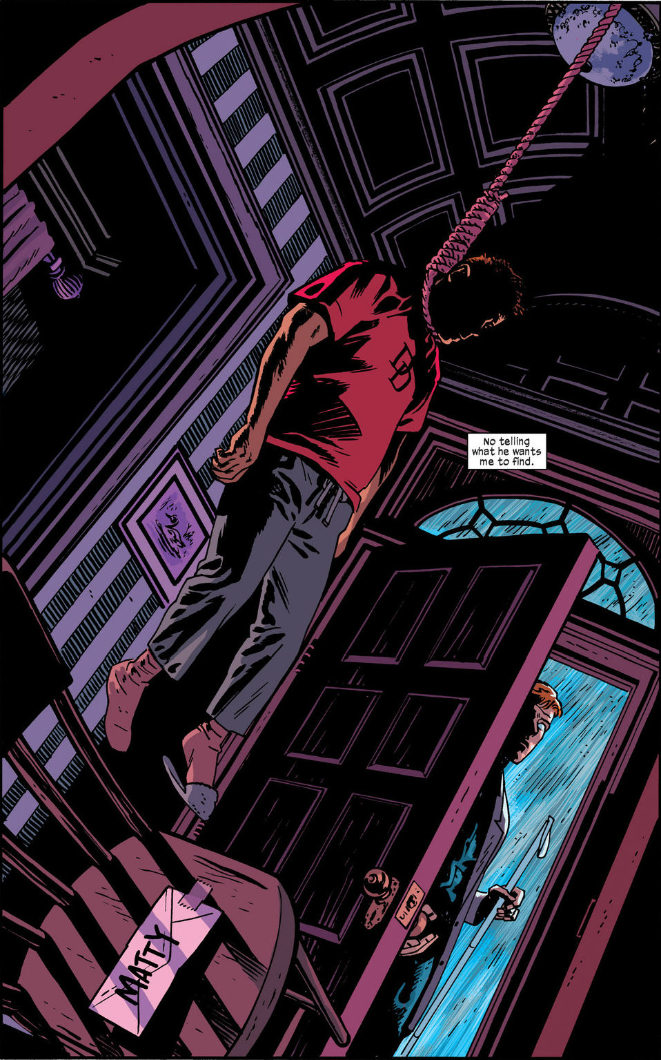 That certainly looks like Foggy dangling from the rafters, but I sincerely doubt that Foggy is dead. I’m reminded a bit of issue 28, which concluded with the suggestion that Matt had just been shot in the head — we know Waid isn’t going to kill his hero, but it’s still an exciting way to end an issue. I certainly feel like Foggy might be just as sacred, and while killing him would be an incredibly compelling motivator for Matt, I’m just not sure the Jester is worthy of that level of ire. More importantly, this issue demonstrates just how skilled the Jester is at forgery. It could be a drugged Foggy in a harness, or just some rando Jester popped a Daredevil shirt on.