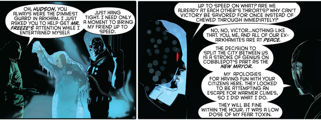 Scarecrow is on a mission to approach all of the former Arkham inmates to warn them of a coming war with the former Blackgate inmates. This is made rather simple by the fact that Penguin divvied-up Gotham into territories lorded over by each of the Batman rogues. Scarecrow makes stops with Mr. Freeze, Riddler, Killer Croc, and Poison Ivy, slowly realizing that the Blackgate inmates are being led by Bane. Oh, and then Scarecrow kills Hudson, the Arkham guard who apparently exists for the sole purpose of being killed by Scarecrow.