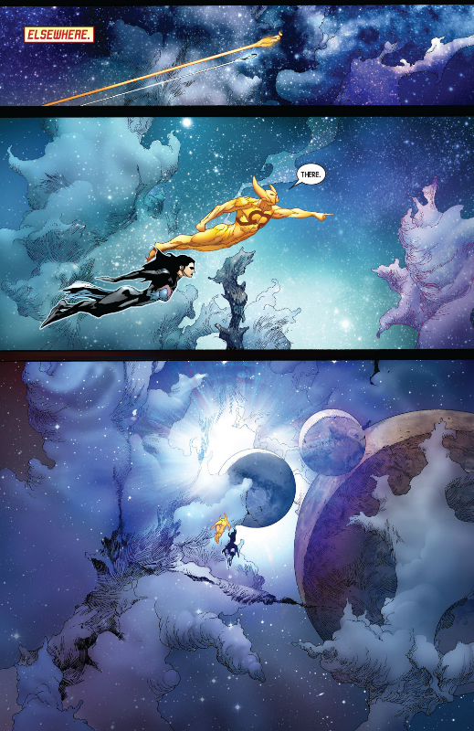 I suppose the specific mindset of the Ex Nihila is important for explaining the apparent mutiny that has just solidified, but I’m not sure I understand the mechanism. The Abyssi, having been created to judge life, wasted away when there was no new life to judge, but the Ex Nihila, having been created to create life, are able to keep on truckin’ when there’s no new life to make? It seems arbitrary, but more importantly, it seems unnecessary: the “previously on” page recalls Ex Nihilo’s words about wonton destruction going against everything he was ever taught. It seems like there’s an ideological conflict that should be enough to pit the Ex Nihila against the Builders, and adding some bizarre beat about how that conflict also allowed their siblings to die just muddies the message. Maybe it will be clearer when we see the same scene four more times throughout the crossover.