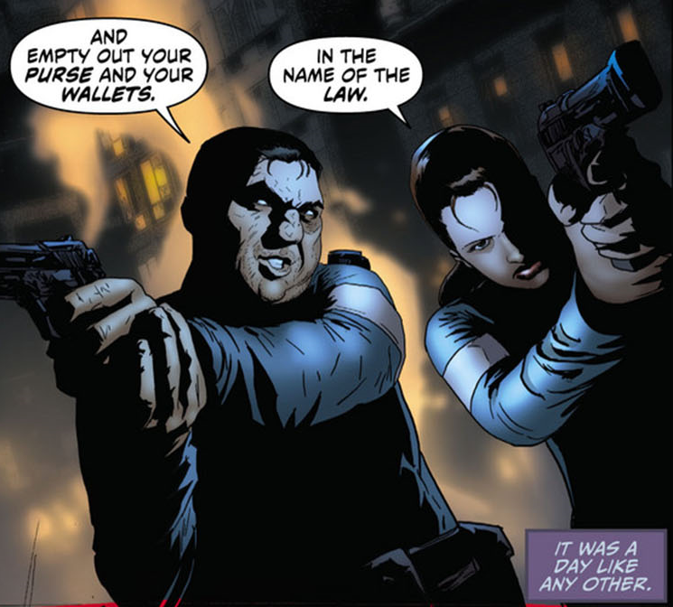 The unclear revelation that it wasn’t the Waynes is an issue, though I think the bigger issue is why the heck were we supposed to think it was the Waynes in the first place? What does it have to do with the story? What does it have to do with the theme? Is there something I’m missing? As it is, it just seems like a misdirect for the purposes of a misdirect. It’s not a great way to start a story.