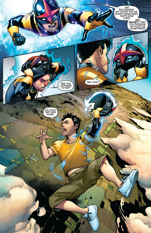 Shelby: I was, actually. I don’t remember if I even finished that first arc of this series, I was so unimpressed with it. As the near 30-year-old curmudgeon that I am, I tend to hate teenagers (especially when they ride my train in the morning and talk so loud), so it’s a hard sell to develop a teen-aged voice that is both appropriate and doesn’t make me roll my eyes. The first couple issues of Nova did not leave me convinced, and since I’m not reading anything else Infinity (with the exception of that one Thunderbolts issue), I did not have high hopes for this one. So, yes, color me pleasantly surprised.