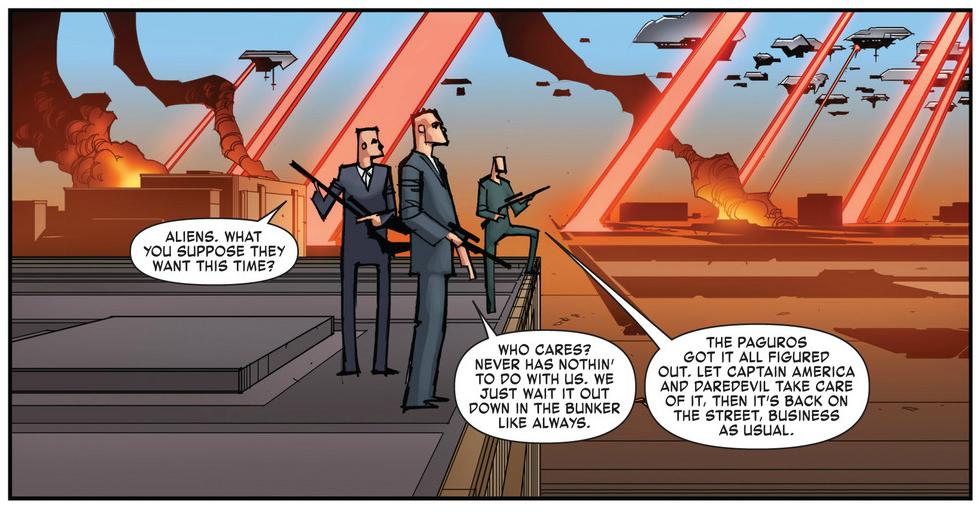 Yeah, the crime families could do something about the aliens destroying New York City, but “never has nothin’ to do with us.” He’s right. Repelling an alien invasion has no part in a crime drama. I didn’t include the panels, but they continue to debate who’s “supposed” to deal with this sort of thing. They rightly deduce that Cap definitely helps fight the aliens, while Daredevil is more of a street-level crime fighter.