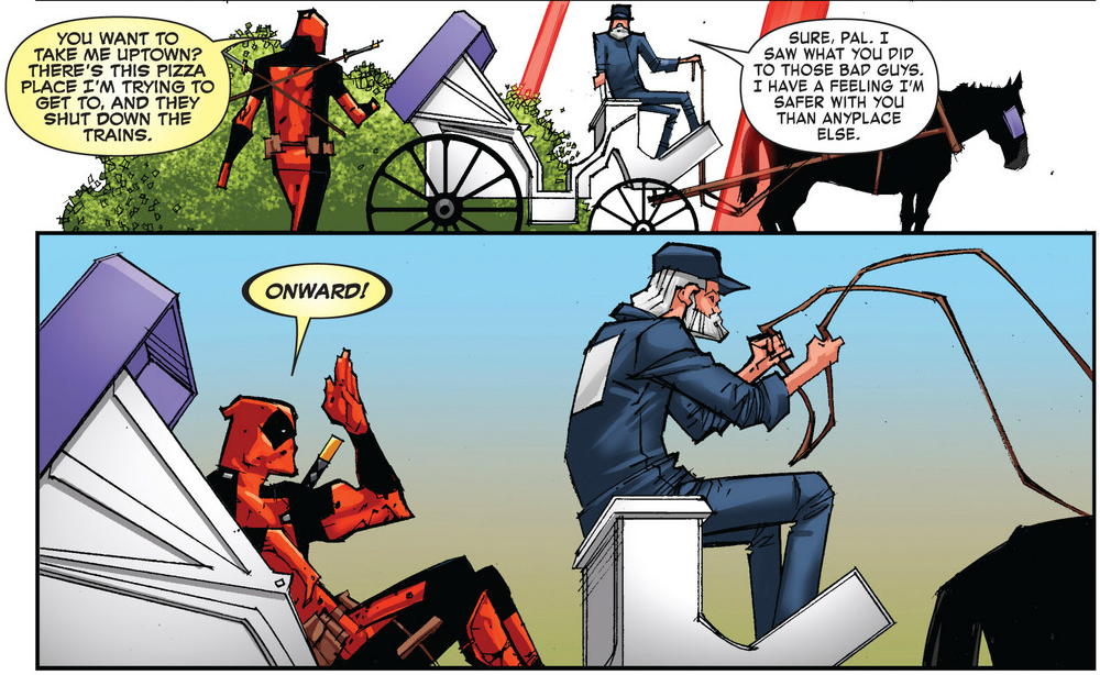 This is an awesome moment, and one that had me laughing out loud – “LOLing” in the common tongue. FACT: Deadpool is always funniest when he’s being cute. More than delivering some adorable chuckles, though, this scene demonstrates the central thesis of this series so clearly. While it wouldn’t make sense for any of the rest of the characters to have this sort of encounter, that doesn’t prohibit Deadpool from having it in this book. It’s more than the character’s themselves having distinct personalities, it’s the world around them adapting the tone the character represents.